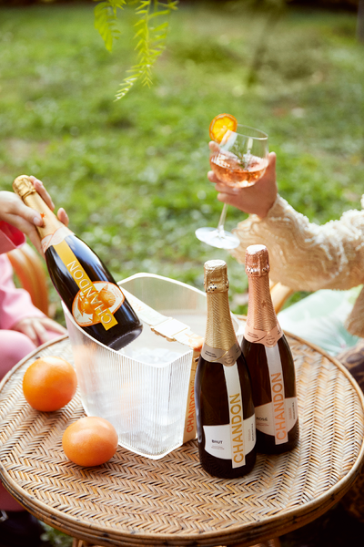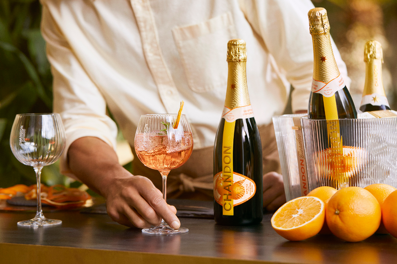 • Wie serviert man Chandon Garden Spritz am besten? Gut gekühlt auf Eis, garniert mit Orange, Minze oder Rosmarin.
