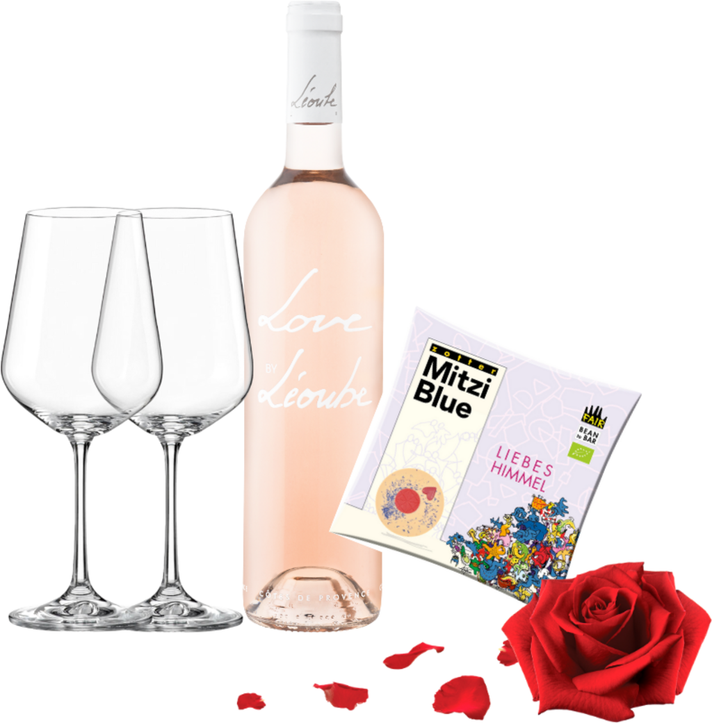 Eine 0,75l Flasche LOVE Rosé 2024 vom Spitzenweingut aus der Provence. Dazu 2 UNO Weingläser von Sophienwald und eine 70g Tafel "Liebeshimmel" Schokolade von Zotter " - Herz, was willst du mehr?