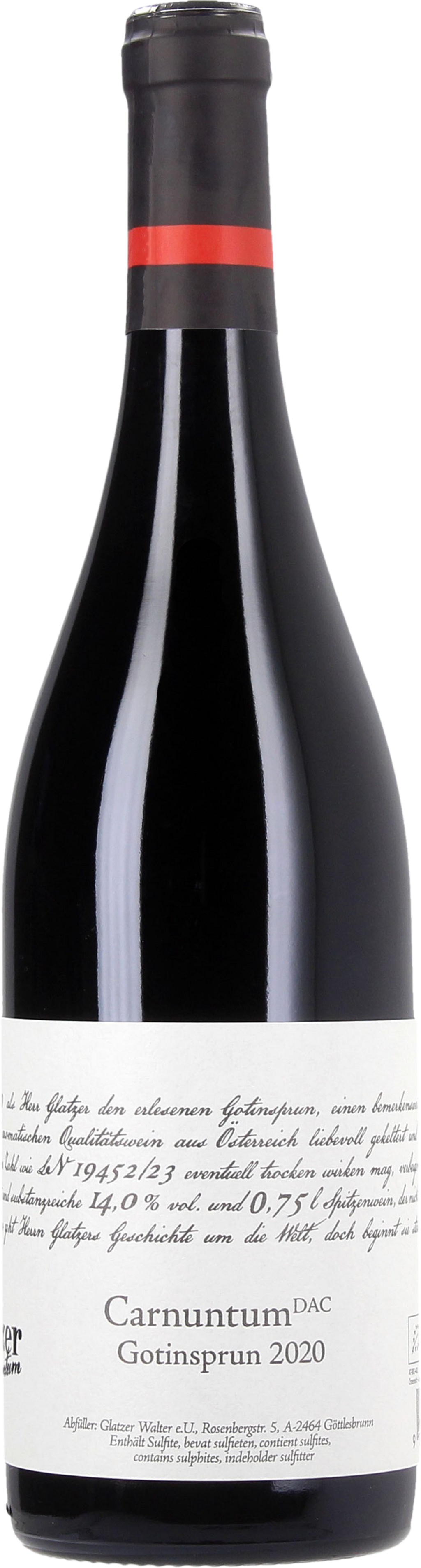 Die elegante und doch kraftvolle Rotweincuvee Gotinsprun (nach der alten Bezeichnung für den Weinort Göttlessbrunn benannt) wurde für 18 Monate in 70% in neuen französischen Barriques ausgebaut. Jetzt präsentiert sich das Flaggschiff des Hauses Glatzer hochwertig und trinkreif. Vermählt aus mind 50% Blaufränkisch, gut 30% Merlot, und je nach Jahr etwas Zweigelt und Syrah kann der Wein aber auch noch mind. 10 Jahre eingelagert werden.
